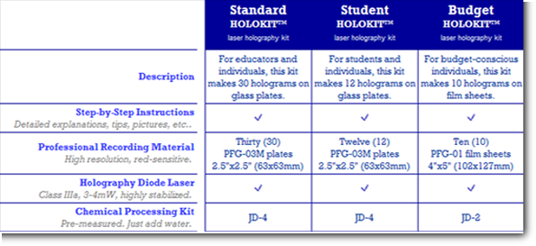 All kits include the same holographic recording materials used by most leading holographic artists and professionals today, and can provide high-level consistency, luminance, and clarity.